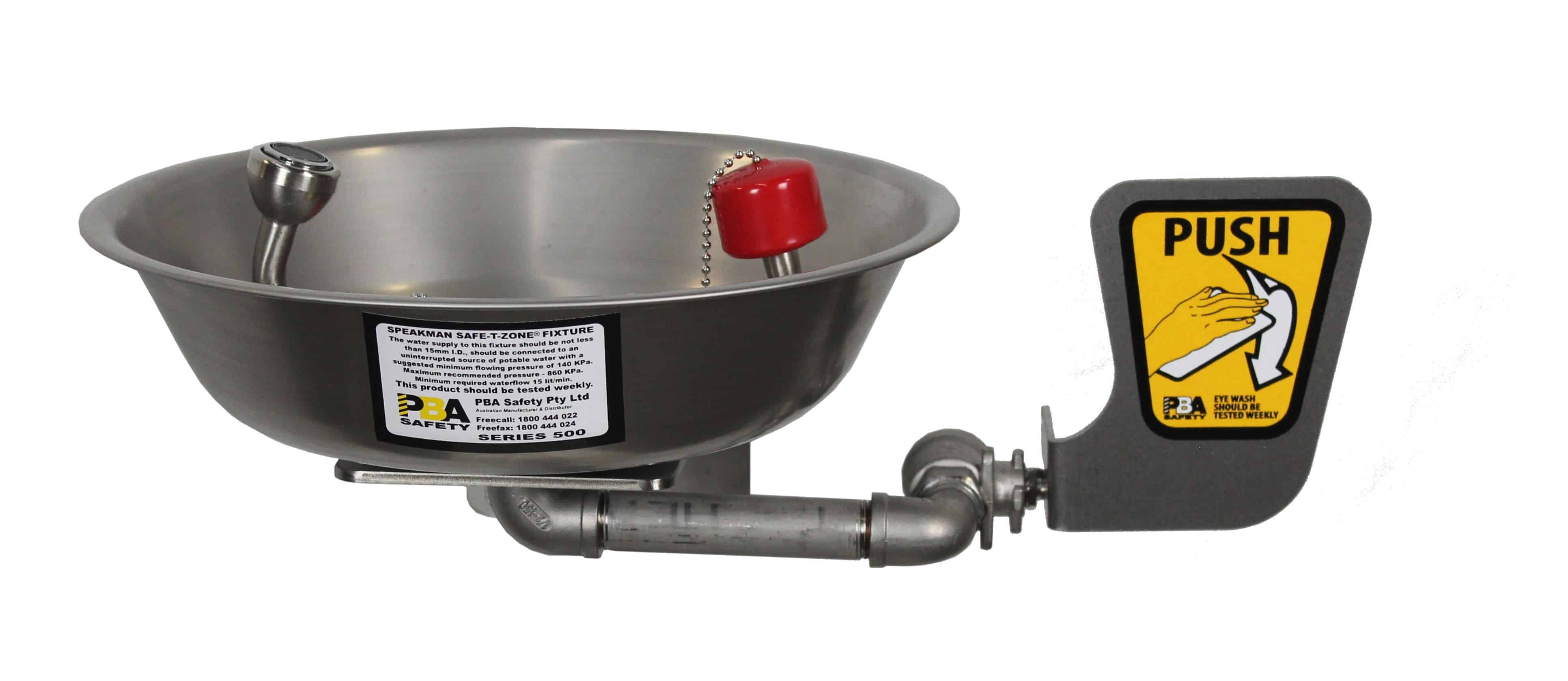 Wall mounted EMERGENCY AERATED EYE WASH unit. Eye wash is supplied with a 15mm stay open full flow ball valve, activated by an activation paddle handle. Manufactured to comply with AS 4775 – 2007
